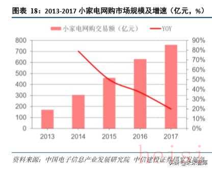 與白電、廚電不同,小家電電商銷售占據(jù)主導(dǎo)地位,線上渠道占比約為 65%-70%。2019 年第一季度數(shù)據(jù) 顯示,榨汁機(jī)、料理機(jī)、豆?jié){機(jī)、電水壺四款產(chǎn)品線上銷售占比均超 70%;電磁爐、電壓力鍋、電飯煲等烹飪 產(chǎn)品線上占比也已超 50%,同樣高于線下渠道。近年來(lái),隨著電子商務(wù)平臺(tái)的蓬勃發(fā)展,小家電產(chǎn)品精巧的外 觀設(shè)計(jì)和獨(dú)特的功能用途可以在線上端得到充分的展示,疊加互聯(lián)網(wǎng)年輕世代消費(fèi)群體的電商購(gòu)物習(xí)慣已經(jīng)形 成。雙向選擇之下,小家電網(wǎng)購(gòu)市場(chǎng)規(guī)模逐步擴(kuò)張,產(chǎn)品線上滲透率持續(xù)走高。