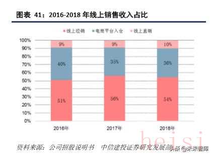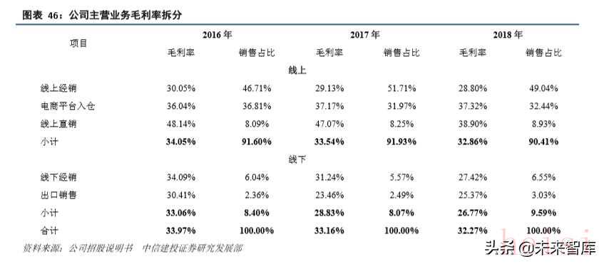 受電商直營(yíng)及平臺(tái)入倉(cāng)拉動(dòng),公司線上毛利率整體高于線下。2018年公司線上及線下(含出口)毛利率分 別為32.86%、26.77%。線上方面,1)公司電商直營(yíng)渠道直面消費(fèi)者,沒(méi)有其他中間環(huán)節(jié),銷售價(jià)格為終端價(jià),因而毛利率最高;2)平臺(tái)入倉(cāng)毛利率次之,根據(jù)與平臺(tái)約定的毛利率及返利情況確定結(jié)算價(jià)格;3)線上經(jīng)銷 中間環(huán)節(jié)較多,毛利率水平較低,2018年為28.8%、