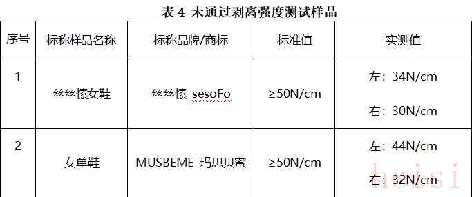 剝離強(qiáng)度項(xiàng)目是考核鞋幫和鞋底粘合質(zhì)量,剝離強(qiáng)度差的產(chǎn)品在穿著過程中幫底粘合部位易發(fā)生脫膠,影響使用壽命。測(cè)試結(jié)果顯示,2款樣品未能通過此項(xiàng)測(cè)試,絲絲愫 sesoFo、MUSBEME 瑪思貝蜜上榜。