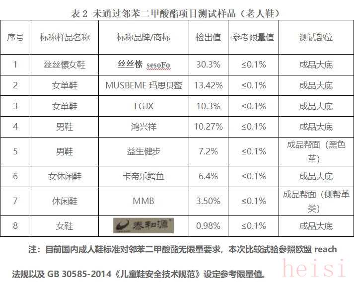 1月27日廣州、佛山兩地消委會(huì)聯(lián)合發(fā)布的《老人鞋比較試驗(yàn)報(bào)告》顯示,TRUMPPIPE男商務(wù)休閑皮鞋,可致癌芳香胺染料超標(biāo)8.8倍。另外,絲絲愫、卡帝樂鱷魚等8款成人鞋塑化劑超標(biāo),最高超標(biāo)302倍,可能危害人體健康。