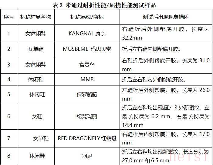 耐折性能/屈撓性能項(xiàng)目是評(píng)價(jià)鞋底是否容易斷裂、幫面材料是否容易出現(xiàn)裂面、裂漿和幫底是否容易開膠,耐折性能/屈撓性能不滿足標(biāo)準(zhǔn)要求的鞋,在穿著過程中最常發(fā)生的問題是鞋底斷裂、幫面裂漿、裂面或幫底、底墻開膠等問題,影響鞋的使用壽命。測(cè)試結(jié)果顯示,8款樣品未通此項(xiàng)目測(cè)試,富貴鳥、RED DRAGONFLY紅蜻蜓、保羅駱駝等品牌上榜。