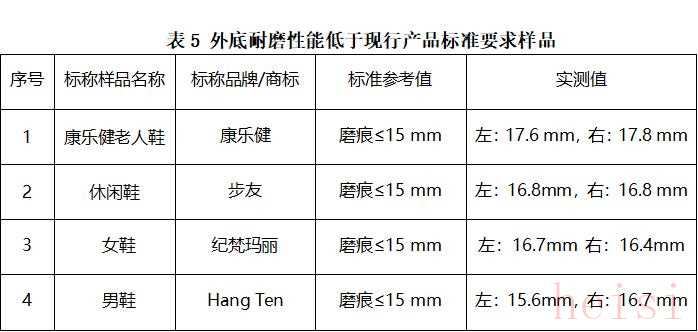 現(xiàn)行相關(guān)標(biāo)準(zhǔn)中,對(duì)不同材質(zhì)產(chǎn)品的外底耐磨性能標(biāo)準(zhǔn)值有不同的要求,測(cè)試結(jié)果顯示,康樂健、步友、紀(jì)梵瑪麗、Hang Ten等4款樣品的外底耐磨性能的實(shí)測(cè)值低于現(xiàn)行產(chǎn)品標(biāo)準(zhǔn)最低要求,表現(xiàn)較差。