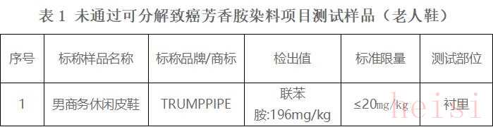 但1款標(biāo)稱品牌為“TRUMPPIPE男商務(wù)休閑皮鞋”樣品的成品襯里(織物)的可分解致癌芳香胺染料“聯(lián)苯胺”實(shí)測(cè)值為196mg/kg,超出標(biāo)準(zhǔn)限量要求。該款皮鞋的標(biāo)稱生產(chǎn)商為青島踏實(shí)商貿(mào)有限公司。
