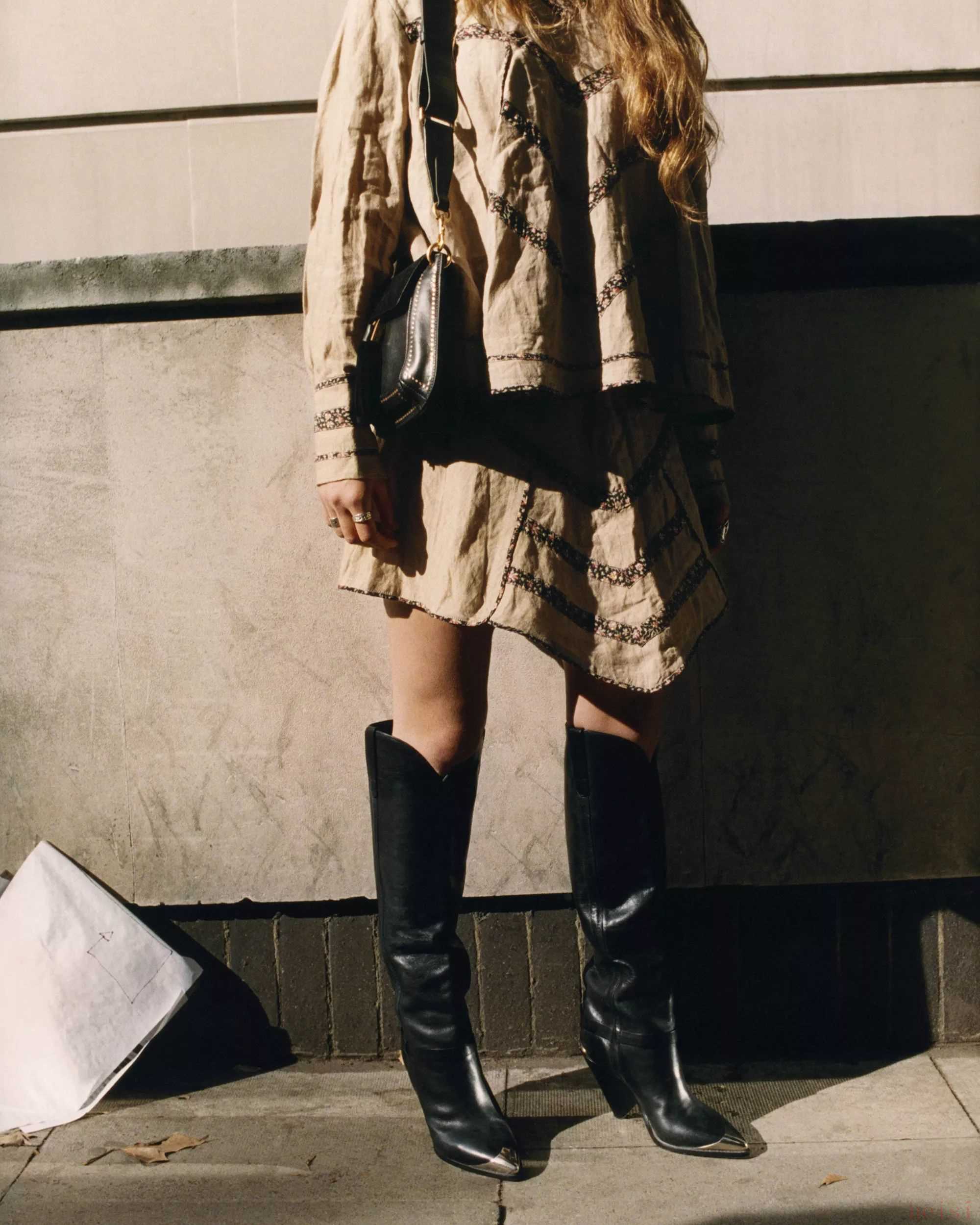 還有這種寬松到甚至有點(diǎn)垂墜質(zhì)感的長靴 ,寬松的靴筒加上剛好的長度顯得腿細(xì)長。無論是像模特這樣配裙子還是搭配褲子,都能展現(xiàn)你的率性自然,極具西部風(fēng)情,