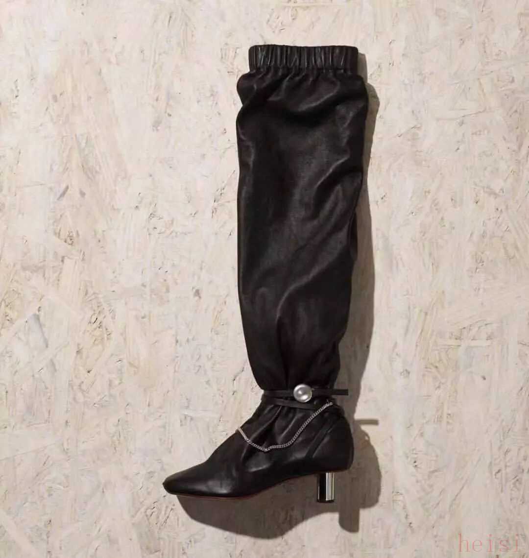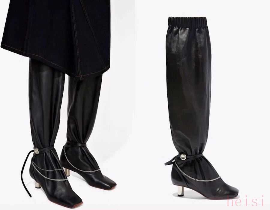 這雙靴子全貌長這樣,松緊帶設(shè)計(jì)可以讓你隨意調(diào)節(jié),長度隨心變!腳踝處還有鏈條和綁帶設(shè)計(jì),配上金屬跟,你就是街上最靚的仔!