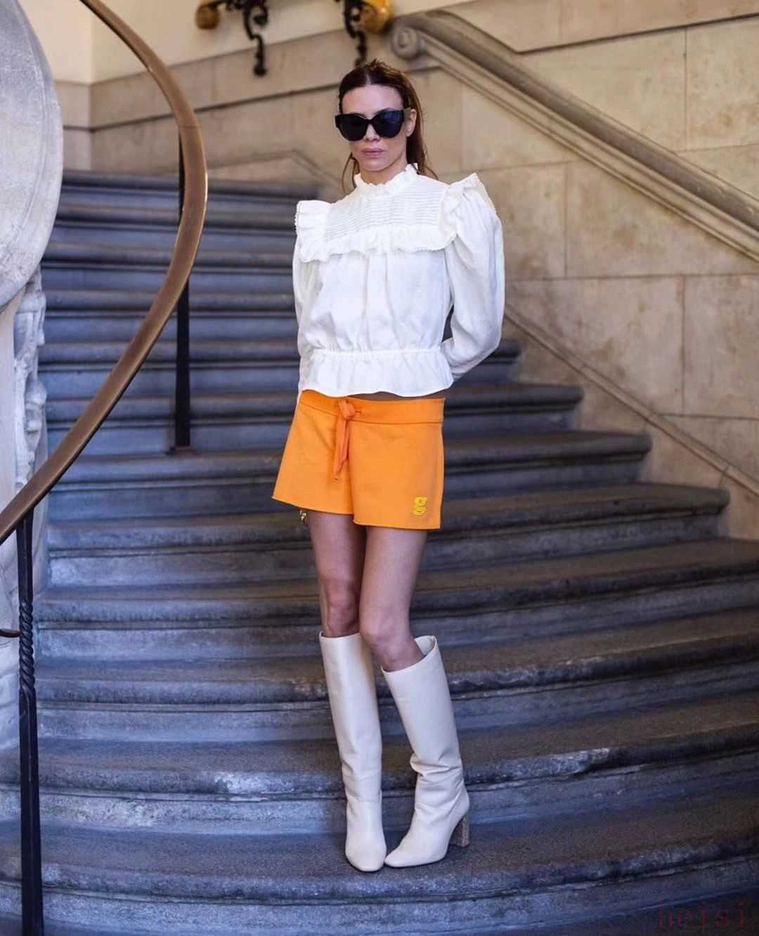Emily Ratajkowski這雙橙色長靴配上黑色連衣裙,很亮眼,一下就用靴子點(diǎn)亮了造型。