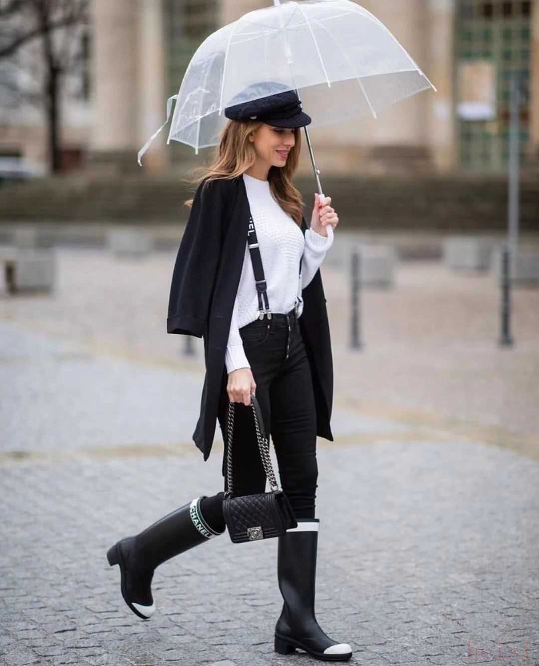 金色靴款或許有些難以駕馭,不過不怕,CHANEL還有很多常規(guī)款的靴子可供選擇,比如下面這款CHANEL的logo的這款黑色雨靴,點(diǎn)綴黑色緊身牛仔褲,永遠(yuǎn)也不過時(shí)。