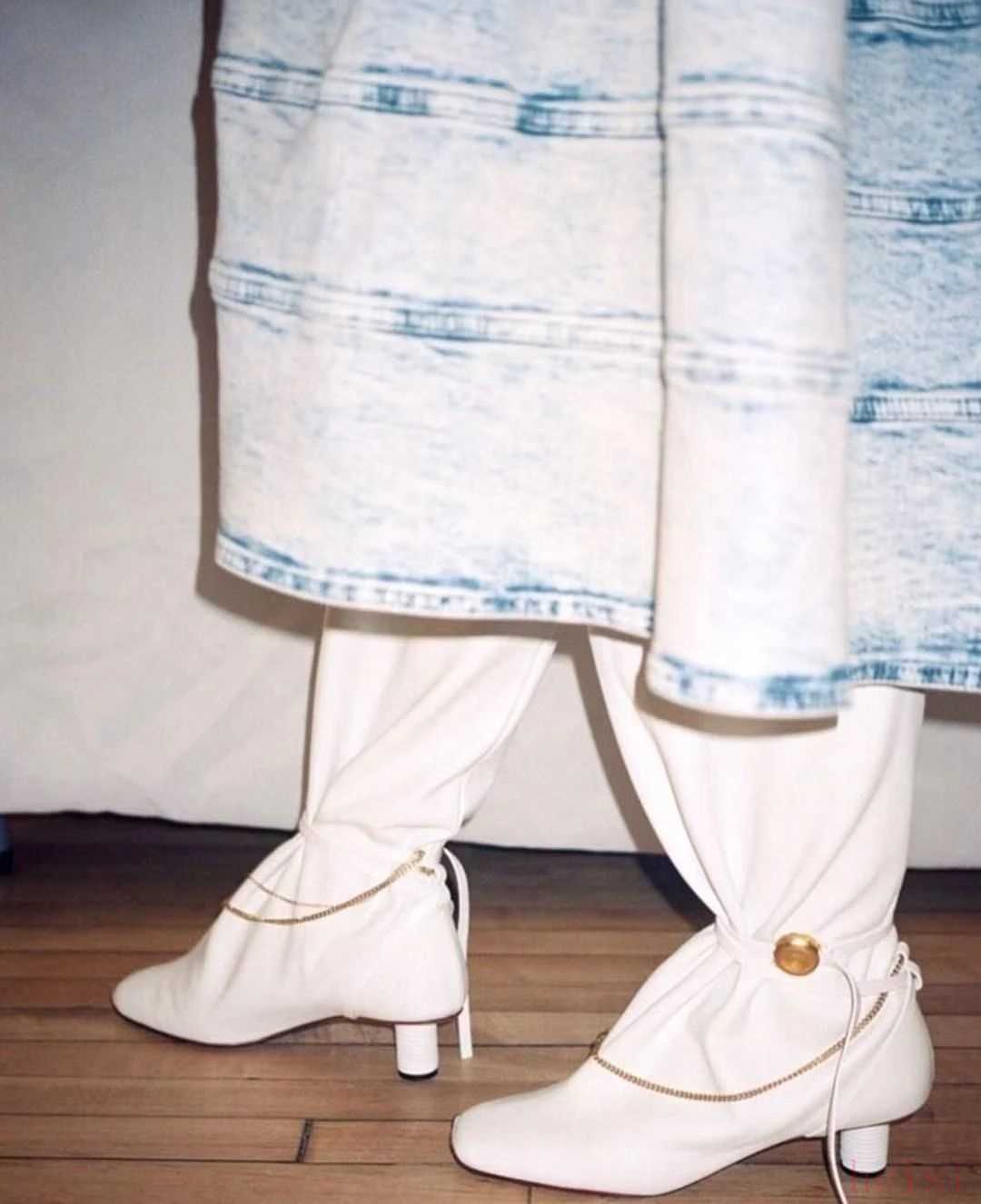 這雙白色長靴在腳踝處加上綁帶設(shè)計(jì),讓靴腿看起來像褲腿,有一種奇妙的視覺效果。