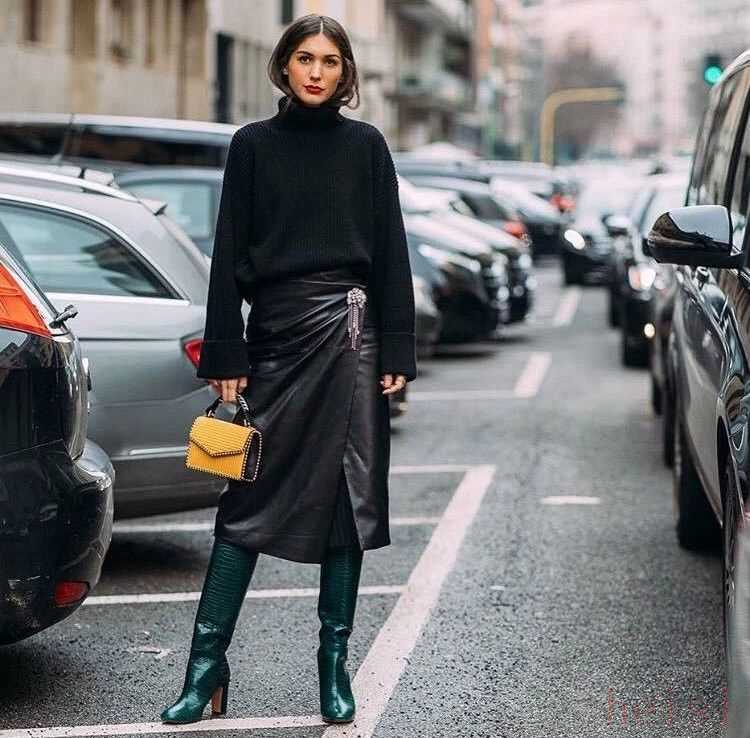直筒不過膝長靴配短裙,露出膝蓋以上的大腿,對腿部自信的女孩不要猶豫就這么穿!