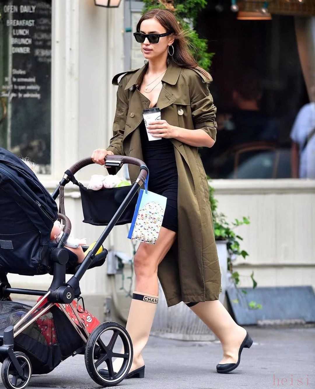 辣媽Irina Shayk也示范了這雙靴子的穿搭,用墨綠色風(fēng)衣和緊身短裙,再加上這雙裸色長靴,延長腿部線條,完美展示出了英國女人的颯。