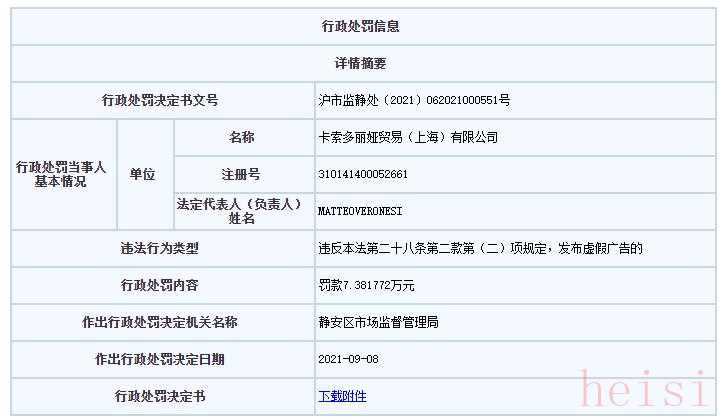 據(jù)上海市場(chǎng)監(jiān)管日前披露的行政處罰信息顯示,卡索多麗婭貿(mào)易(上海)有限公司日前因“發(fā)布虛假?gòu)V告”被上海市靜安區(qū)市場(chǎng)監(jiān)督管理局罰款7.381772萬(wàn)元,處罰決定日期為2021年9月8日。