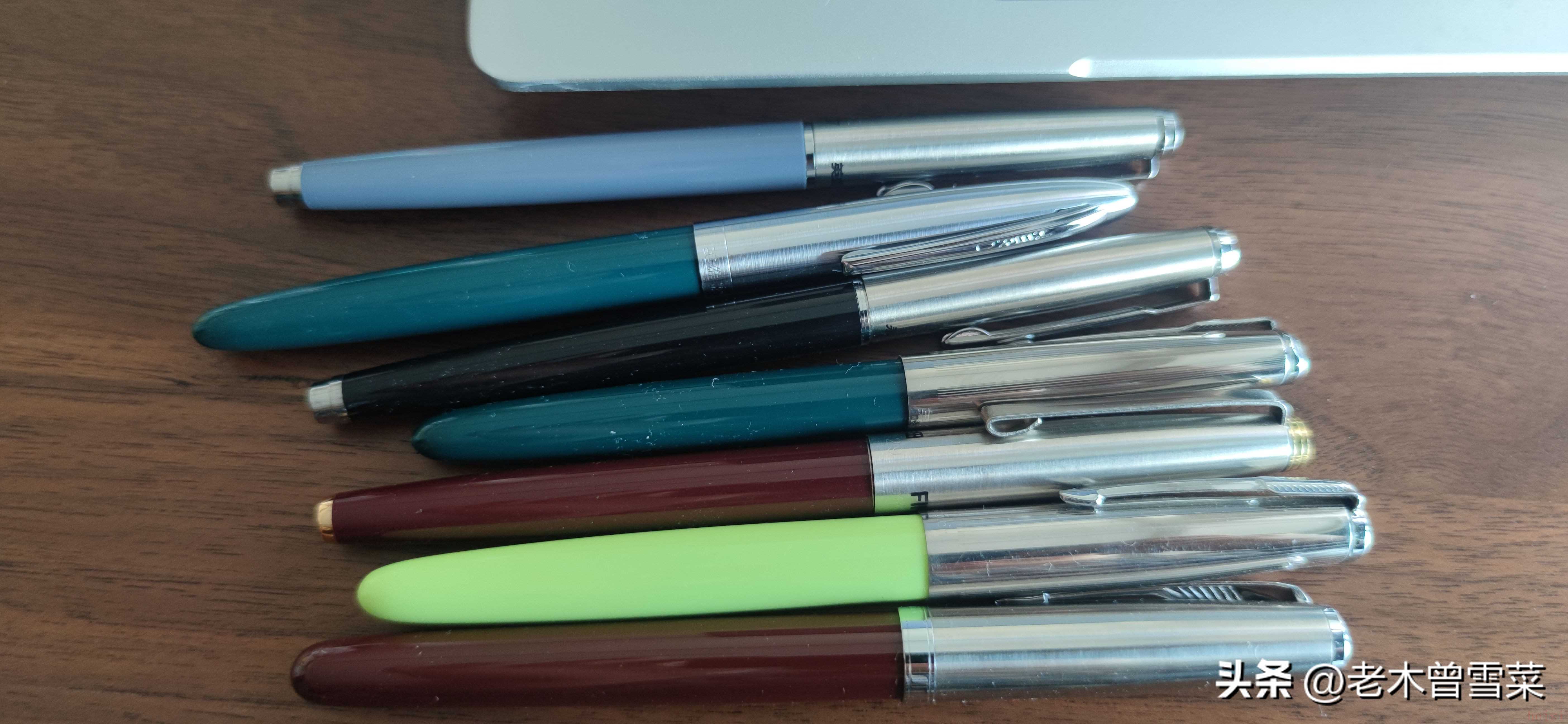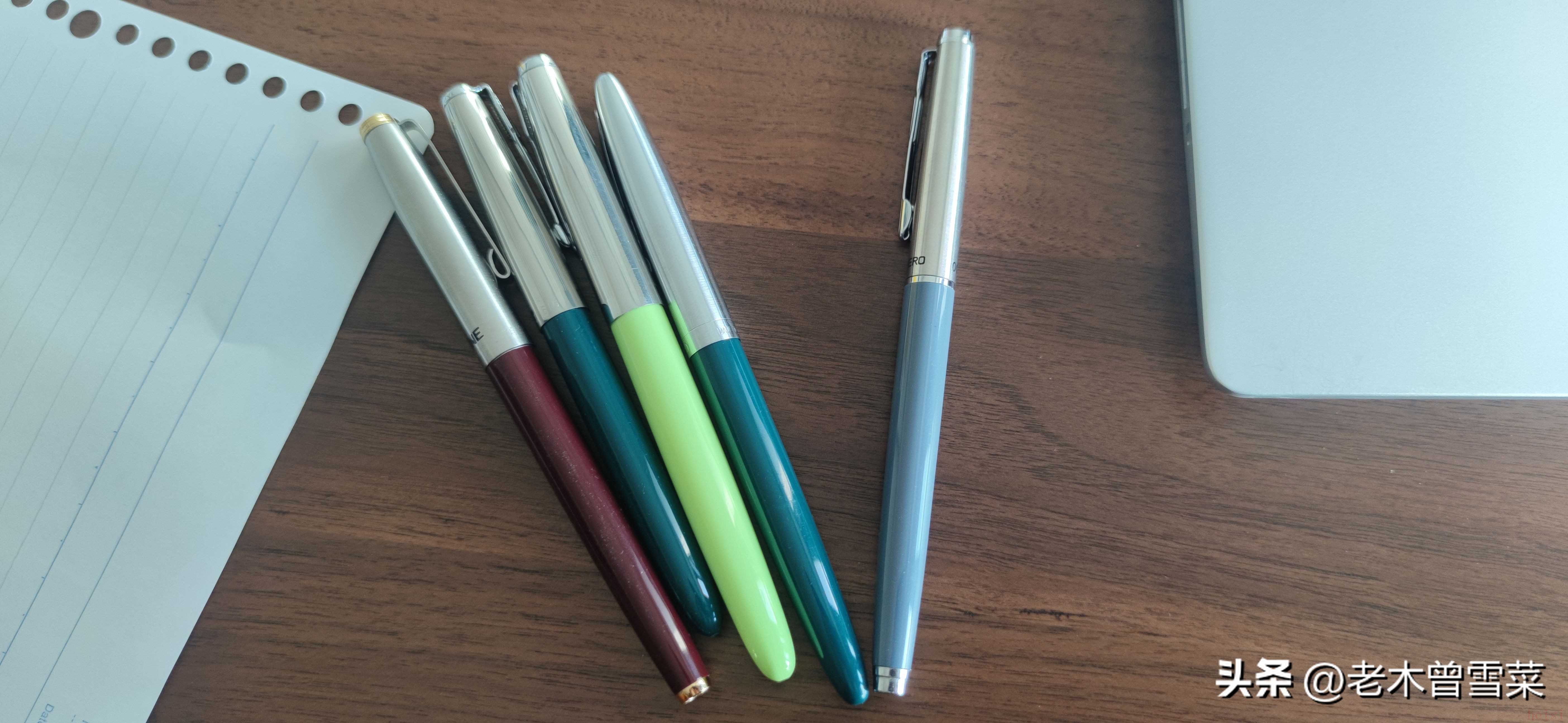 暗尖鋼筆本質上都是派克51的仿制產物,如今的筆款多少保留以51為基礎的外觀設計,對于51仿制程度最高的筆是英雄616和金豪616,本次對比的平價暗尖鋼筆大部分都是這樣的經典設計。區(qū)別在于使用圓頭、偏頭、錐形的天冠筆尾造型,從審美角度我個人認為沒有什么差異。