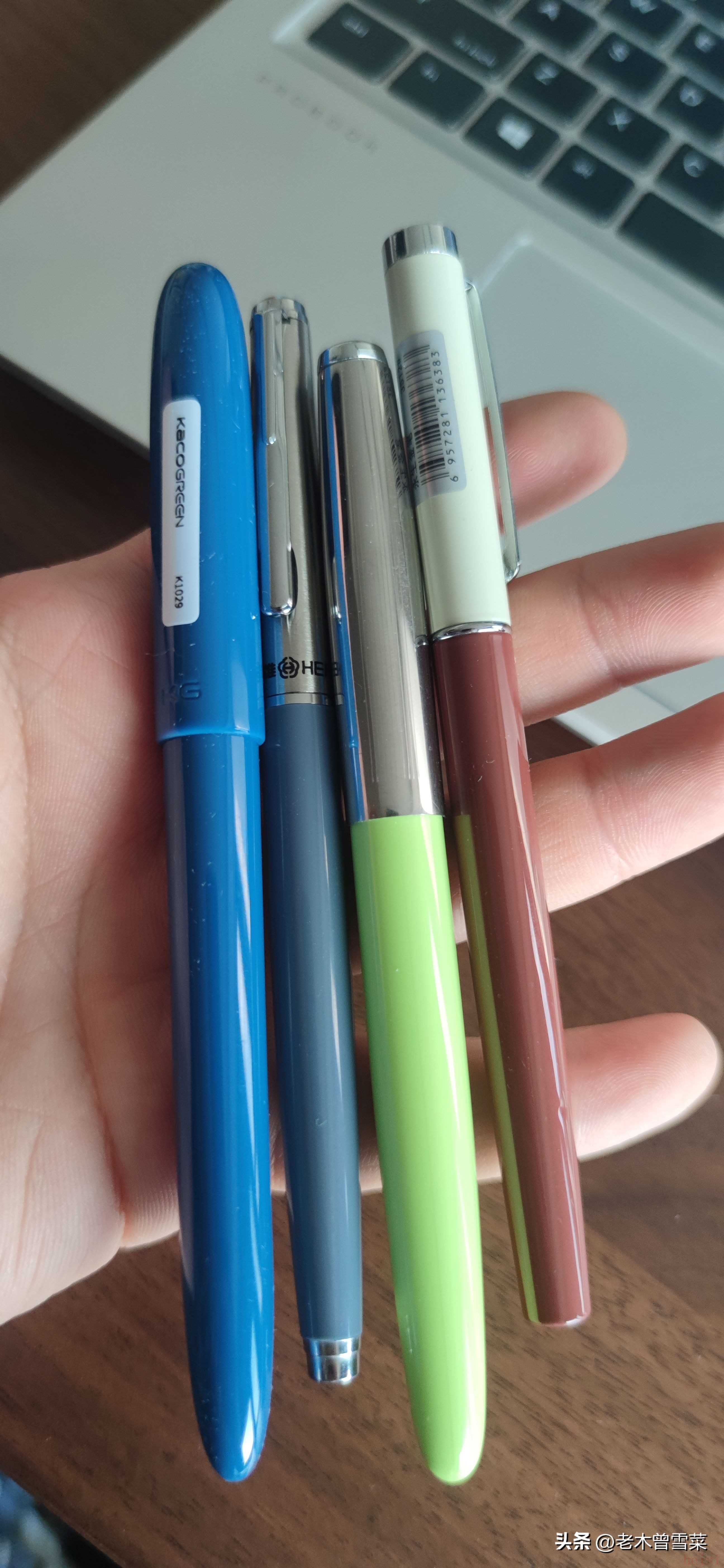 晨光優(yōu)握整體順滑度還可以,但是在國譽上有種滑動不徹底的不暢感,在信筏上表現(xiàn)會好一些,兒童的練字紙張用這個還是可以的,字跡標準粗細,日用不太適合。永生007雖然價格極低,但觸紙有一定的硬糯感,當然不像英雄100的金筆,但書寫感要好上不少,字跡非常細,基本可以等同于日本筆的F尖,這款鋼筆的書寫略有驚艷。永生3512金屬款筆尖上墨有些不流暢,書寫感受比較奇怪,不太好控制,整體有一定的順滑度,但是下水比較大,字跡顏色明顯偏深。616木桿從我看,筆尖和3512是同款,同樣難控制,但整筆握持感受好過金屬的3512。KACO銳途書寫方面,不好控制的感受更強烈,一個是觸紙會有異?;瑒?,一個是暗尖被筆握包裹更多,書寫視覺感受比較奇怪,不過字跡很細,但不同角度的粗細均一性不好。金豪911書寫控制相對容易,但不同角度筆畫粗細變化有些膈應,粗細為標準粗細。金豪86的配尖從觀感上講,應該和911一樣是通模筆尖,但我這支控制就不如911容易,并且下水不均偏少,個人認為是金豪品控的問題,可以說兩支中獎一支,字跡要比911細一些。英雄007出廠打磨就有比較明顯的書寫面,字跡粗,非常水槍,控制感倒是好的,但如此水槍是大部分用戶所不能接受的。329-2的筆尖書寫控制感很好,下水同樣偏大,但因為筆尖銥粒不大,整體上不粗,是一支比較好寫的鋼筆。329雖然標注是特細鋼筆,實際字跡是真的不細,就是下水偏小,打磨也比較奇怪,書寫不好控制,不是一支好用的鋼筆。這支616小號在書寫上也有不好控制的感覺,個人覺得是這枚金色筆尖不好,之前的616不會書寫這么奇怪,字跡就是標準粗細。最后是我的英雄616 plus,因為是一支老筆,毛細有堵塞,字跡異常細,但書寫控制感是比較好的,和329-2保持一致,這是上海英雄廠的技術實力。關于書寫方面,字跡細且好用的筆是最便宜的永生007,雖然外觀平平無奇,但真的有不錯的書寫效果。英雄616plus和329-2確定是上海英雄鋼筆廠出品,整體使用體驗較好。永生3512、英雄007,英雄329、KACO銳途是我覺得不太好的鋼筆。另外一些筆款書寫方面比較平庸,并且使用同一筆尖模具的款式,實際使用一致性也談不上理想,考慮到價錢,我會給一個無功無過的評價。