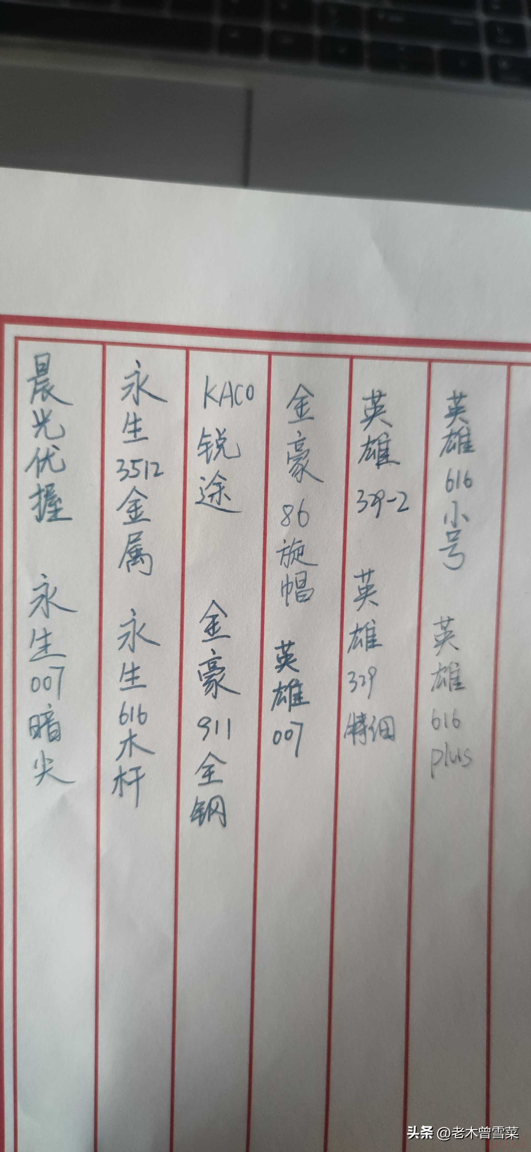英雄:616小號、616 plus、329、329-2、007KACO:銳途金豪:911、86永生(文港):木桿616、3512、3A007晨光:優(yōu)握品牌方面,英雄是毫無疑問的國內暗尖技術最為老道的廠商,英雄趕派克的故事就是對于派克51的仿制,在低端入門價位布局的產品也最多,007價格最便宜,616系列最經典,329系列定位相對高一些。KACO作為國內新興品牌,有銳途這一款暗尖鋼筆,首發(fā)39元,如今已經是十幾塊的價位。金豪是新興的仿制大牌的鋼筆產品,旗下鋼筆多使用公模,911非常經典,金豪86是近幾年的新產品,算是本次測試重點關注的對象。永生(文港)并不是當年和英雄齊名的永生老牌,江西文港縣是走小作坊經濟的文具制造廠區(qū),如果國內的山寨派克、山寨凌美、山寨萬寶龍都出自這里,它們也開發(fā)了文港品牌爛筆頭,永生是收購了商標,在文港生產的文港筆,選了三款,筆桿材質包含木頭、金屬和塑料。晨光在品牌方面我不用多做介紹,國內文具巨頭,選擇了品牌旗下主打兒童市場銷量出色的晨光優(yōu)握鋼筆,來看看它們的技術實力如何。外觀設計綜述