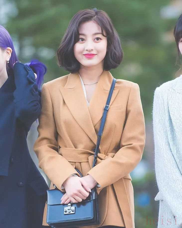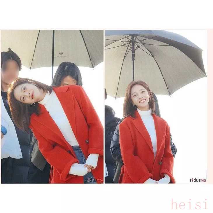 拍戲途中,粉絲前來應(yīng)援。這件外套也在戲里出現(xiàn)過,相比較前面兩款,這件更加修飾腰身,顯得名媛不少。