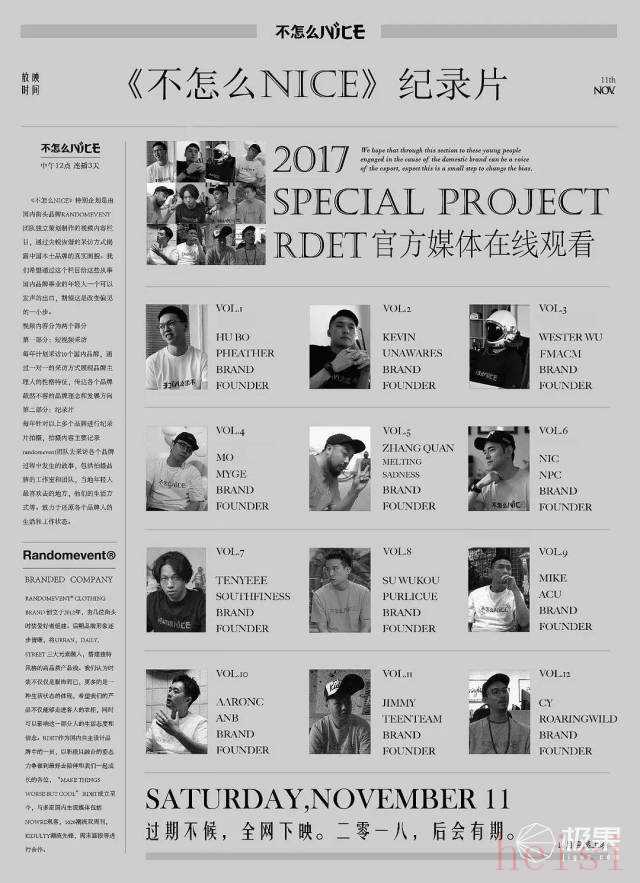 2017年前后,RANDOMEVENT曾辦過(guò)一個(gè)叫做《不怎么NICE》的微訪(fǎng)談視頻項(xiàng)目,節(jié)目里會(huì)12位國(guó)內(nèi)潮牌和店鋪主理人接受“毒舌”采訪(fǎng),同時(shí)也會(huì)被訪(fǎng)者共同推出#不怎么NICE系列聯(lián)名單品。