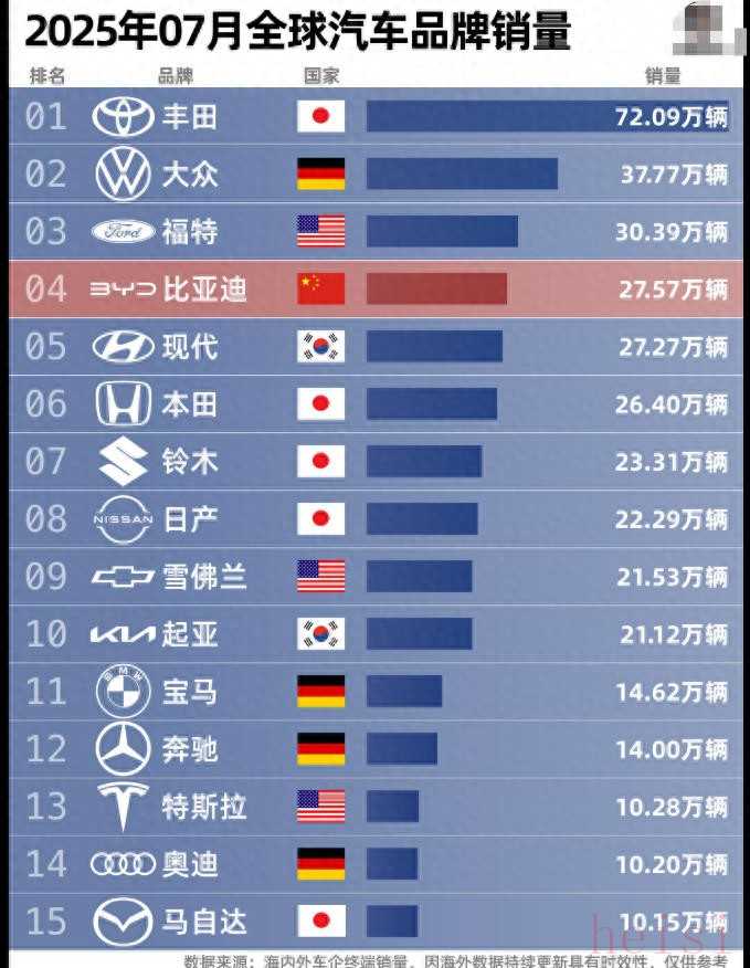 2025 年 7 月全球汽車品牌銷量數(shù)據(jù)近期出爐,榜單既延續(xù)了豐田、大眾等傳統(tǒng)巨頭的統(tǒng)治力,也凸顯出中國車企在新能源賽道的強勢突圍 —— 比亞迪雖在總榜跌出前三,但新能源領域依舊斷層領先;吉利、奇瑞等品牌則憑借新能源車型的爆發(fā),展現(xiàn)出沖擊全球頭部陣營的潛力,全球車市 “燃油車守成、新能源車進攻” 的格局愈發(fā)清晰。