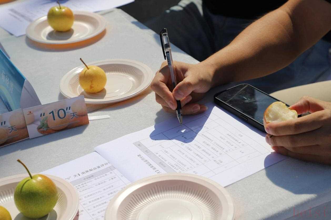 開園儀式后,南果梨品鑒活動成為現(xiàn)場焦點(diǎn)。與會嘉賓現(xiàn)場品嘗“采摘當(dāng)天”“采摘后5天”“采摘后10天”三個后熟階段的南果梨,直觀感受其從清脆到綿甜的風(fēng)味變化。經(jīng)現(xiàn)場打分統(tǒng)計(jì),采摘10天后的南果梨因香氣最濃、口感綿甜適中獲最高分,印證了南果梨“后熟風(fēng)味更佳”的特性;采摘當(dāng)天及采摘后5天的果實(shí)也因口感清脆、風(fēng)味清新獲嘉賓認(rèn)可,展現(xiàn)出不同階段的產(chǎn)品特色。