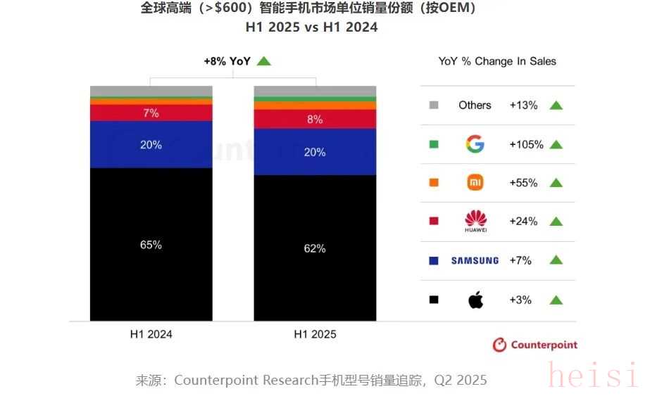 其中,蘋果(Apple)在上半年仍然是最大的品牌,同比增長3%,在高端市場份額達(dá)62%。但由于其他OEM廠商增速更快,蘋果的份額有所回落,國內(nèi)市場份額在被華為與小米蠶食。憑借忠誠用戶群與強(qiáng)大的線下覆蓋率,華為在國內(nèi)市場仍極具吸引力,并通過諸如三折疊Mate XT等獨特設(shè)計機(jī)型,不斷收復(fù)份額并贏得消費者的青睞。