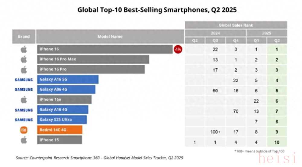前段時間,市場調(diào)研機(jī)構(gòu) CounterPoint Research 公布了2025年第二季度全球最暢銷 TOP 10手機(jī)排名。榜單顯示,蘋果占據(jù)五個席位,三星占據(jù)四席,小米也有一款機(jī)型上榜。