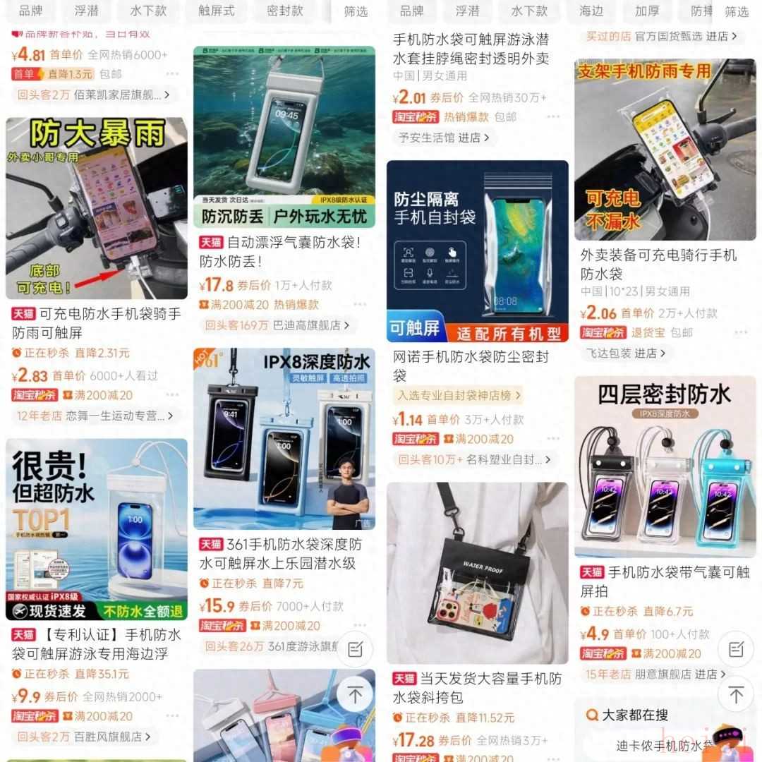 1.銷量最高的往往是低價(jià)單品,通常不超過10元,構(gòu)成了當(dāng)下這一市場里最主流的價(jià)格帶。《天下網(wǎng)商》在淘寶上搜索發(fā)現(xiàn),賣得最好的,是一款售價(jià)6.75元的防水袋,累計(jì)賣出了40多萬件。產(chǎn)品的背后是一家主營戶外產(chǎn)品的店鋪,除了賣手機(jī)防水袋,還有一次性雨衣、鞋套、冰袖等。