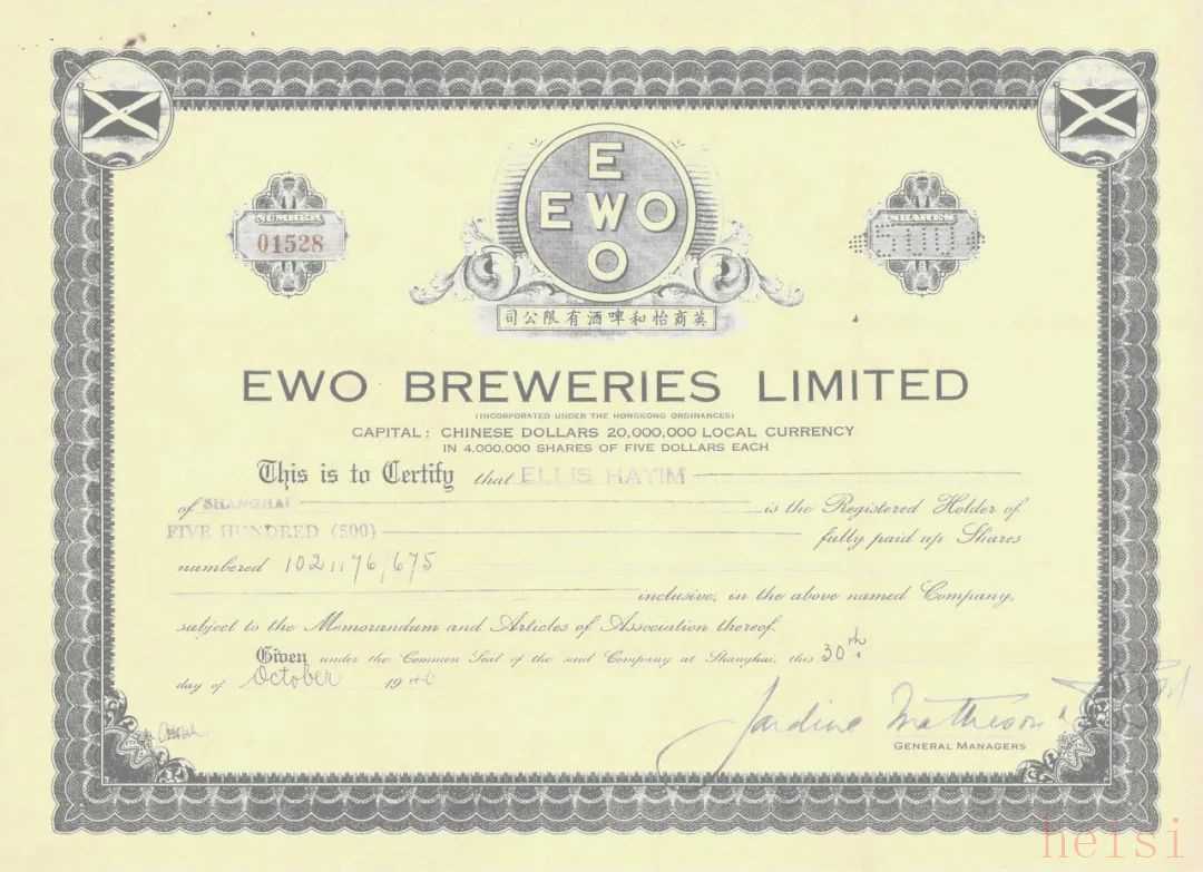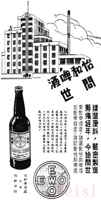 華光啤酒廠的前身就是英商怡和洋行于1936年開辦的怡和啤酒廠,其地址位于楊浦區(qū)定海路350號,主要產(chǎn)品有黃啤、黑啤、紅啤、麥汁飲料健身露等。商標(biāo)為EWO(怡和)牌。這是怡和洋行在中國興辦的設(shè)備先進、機械化程度較高、規(guī)模較大的一家工廠。
