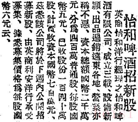 當(dāng)時的怡和啤酒廠共投資500萬元,分做500萬股。啤酒廠建成后,英商立刻將這個廠股票的75%(即375萬股,每股一元)陸續(xù)投入股票市場。由于當(dāng)時處于半殖民地半封建時期,國內(nèi)政治不穩(wěn)定,經(jīng)濟混亂,有資產(chǎn)的人擔(dān)心自己的資產(chǎn)沒有保障,因而要在市場上尋求外國人辦的工廠的股票購入。英商利用投資者這種心理,把股票的面值從1元提到2元、3元甚至5元、6元1股。