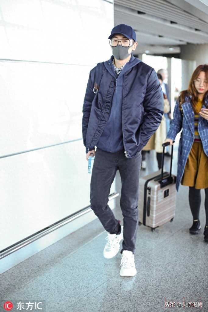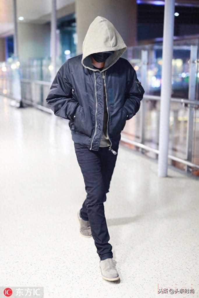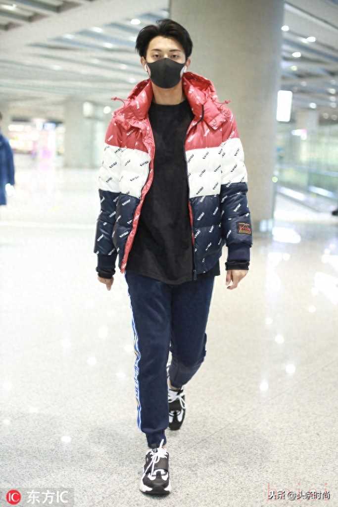 黃子韜拼色棉衣外套+黑色衛(wèi)衣時(shí)髦疊穿,深藍(lán)色運(yùn)動(dòng)褲+運(yùn)動(dòng)鞋簡(jiǎn)單帥氣。
