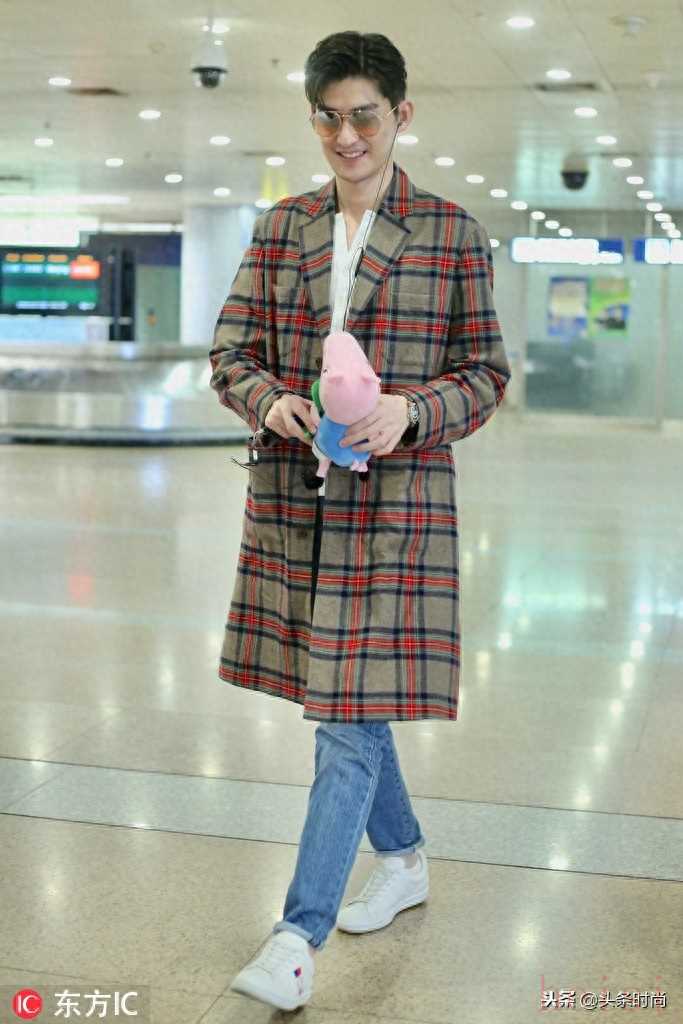張翰格紋大衣+牛仔褲帥氣型男,墨鏡+小白鞋清爽干凈。