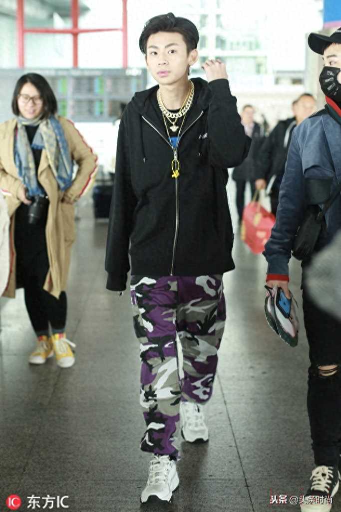 小鬼王琳凱黑色連帽衛(wèi)衣+迷彩休閑褲時(shí)髦帥氣,運(yùn)動(dòng)鞋簡(jiǎn)單休閑。