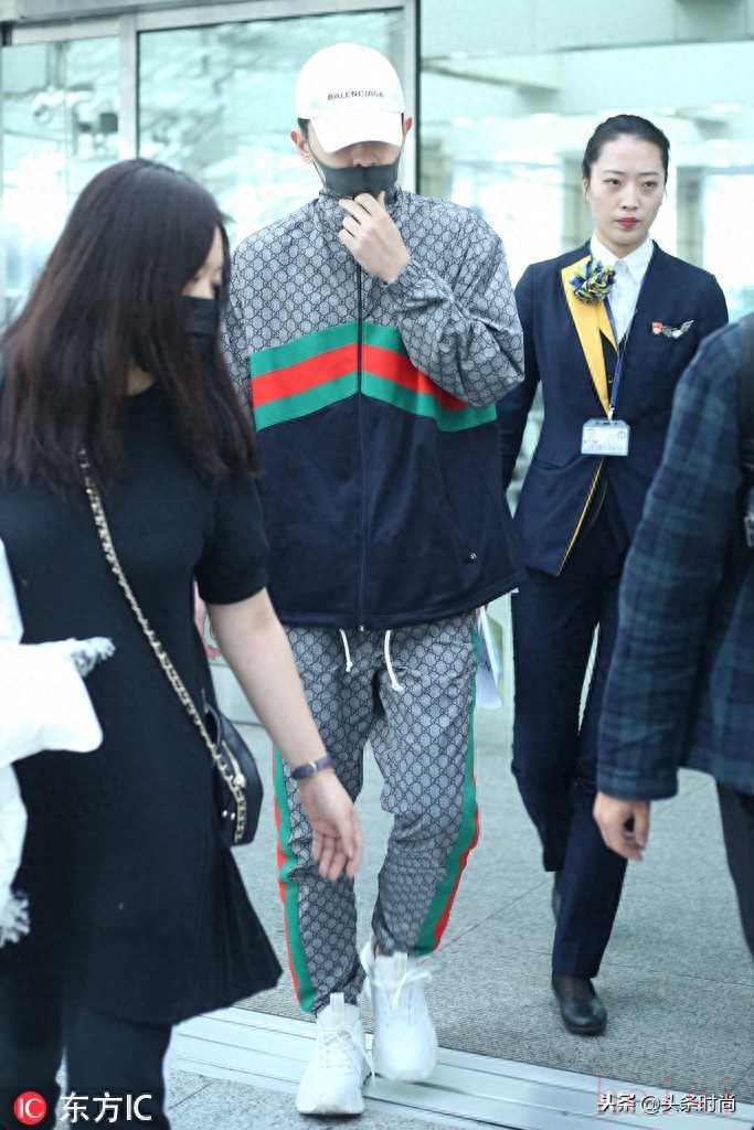 鄧倫Gucci拼色套裝+白色運(yùn)動(dòng)鞋潮范十足,Balenciaga白色棒球帽簡(jiǎn)約低調(diào)。