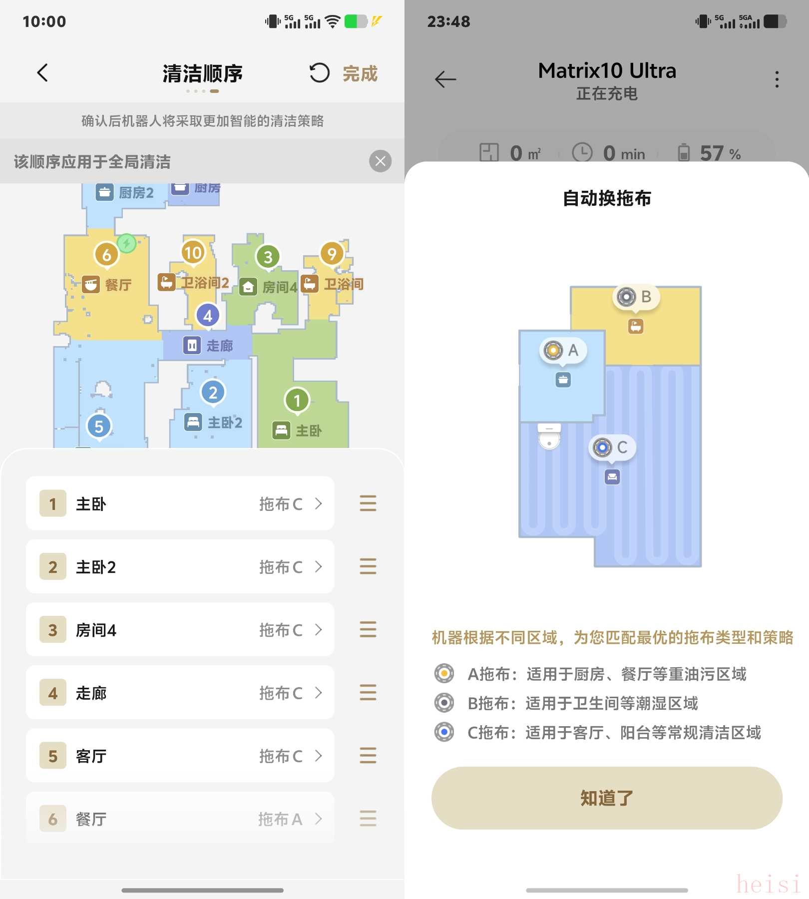 落到具體的體驗(yàn)上,Matrix10 Ultra在建圖的同時(shí)會(huì)根據(jù)畫面識(shí)別進(jìn)行智能分區(qū),初步判斷空間組成,并為其匹配拖布和清潔順序。如果沒有特殊需求,小雷個(gè)人認(rèn)為系統(tǒng)根據(jù)建圖智能匹配的拖布配置和清潔步驟已經(jīng)足夠。當(dāng)然,如果你有需求,后續(xù)也能自己調(diào)整情節(jié)順序和拖布配置,自由度相當(dāng)高。