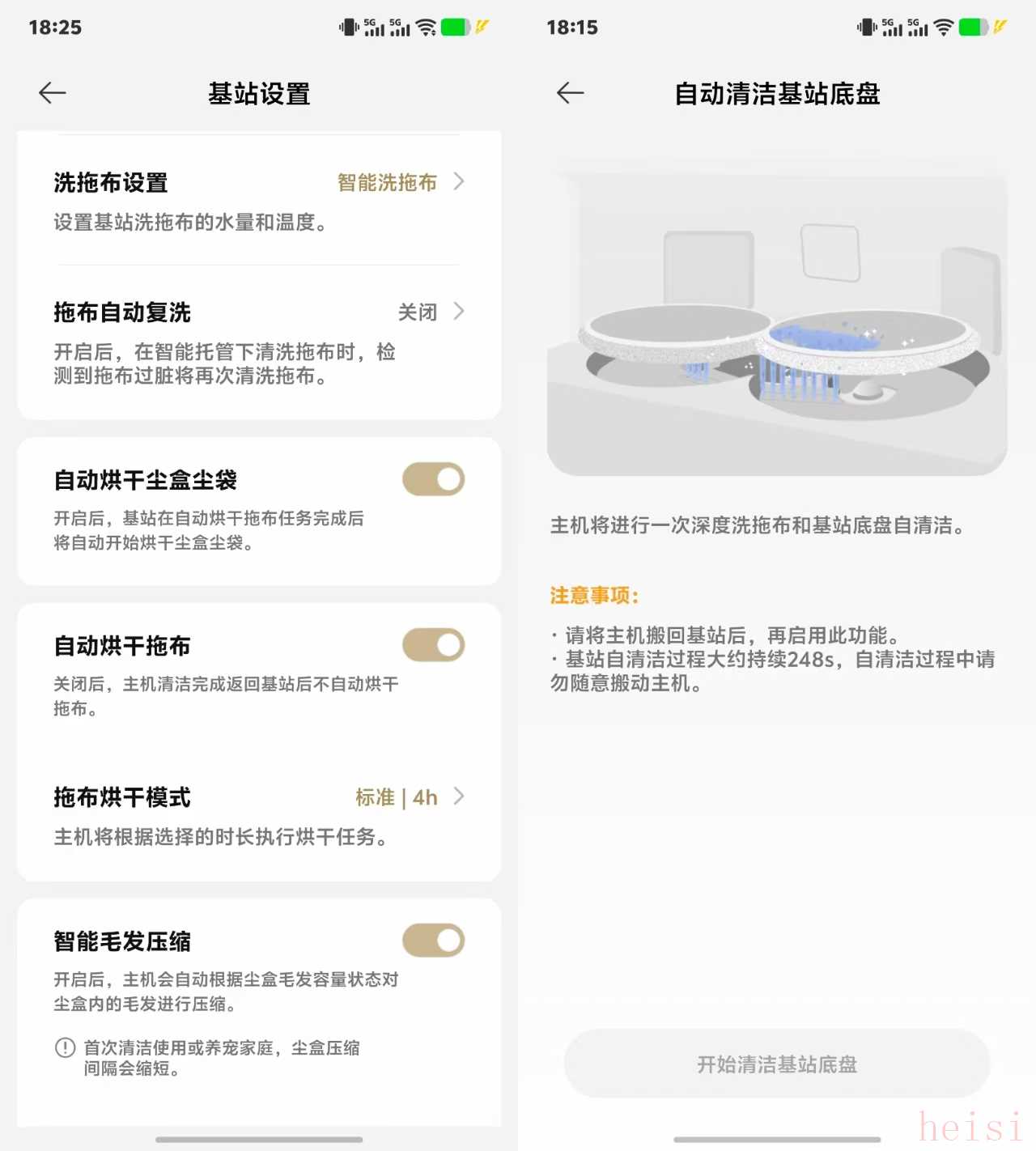 而在App當(dāng)中,你還能找到大量的基站設(shè)置,涉及清潔液加注、拖布清洗和烘干、集塵袋(含毛發(fā)壓縮等),以及自動(dòng)深度底盤清潔。一般情況下,基站底盤自清潔不需要頻繁使用,但當(dāng)主機(jī)進(jìn)行過強(qiáng)度較高的清潔之后,建議是啟動(dòng)一次底盤自清潔。