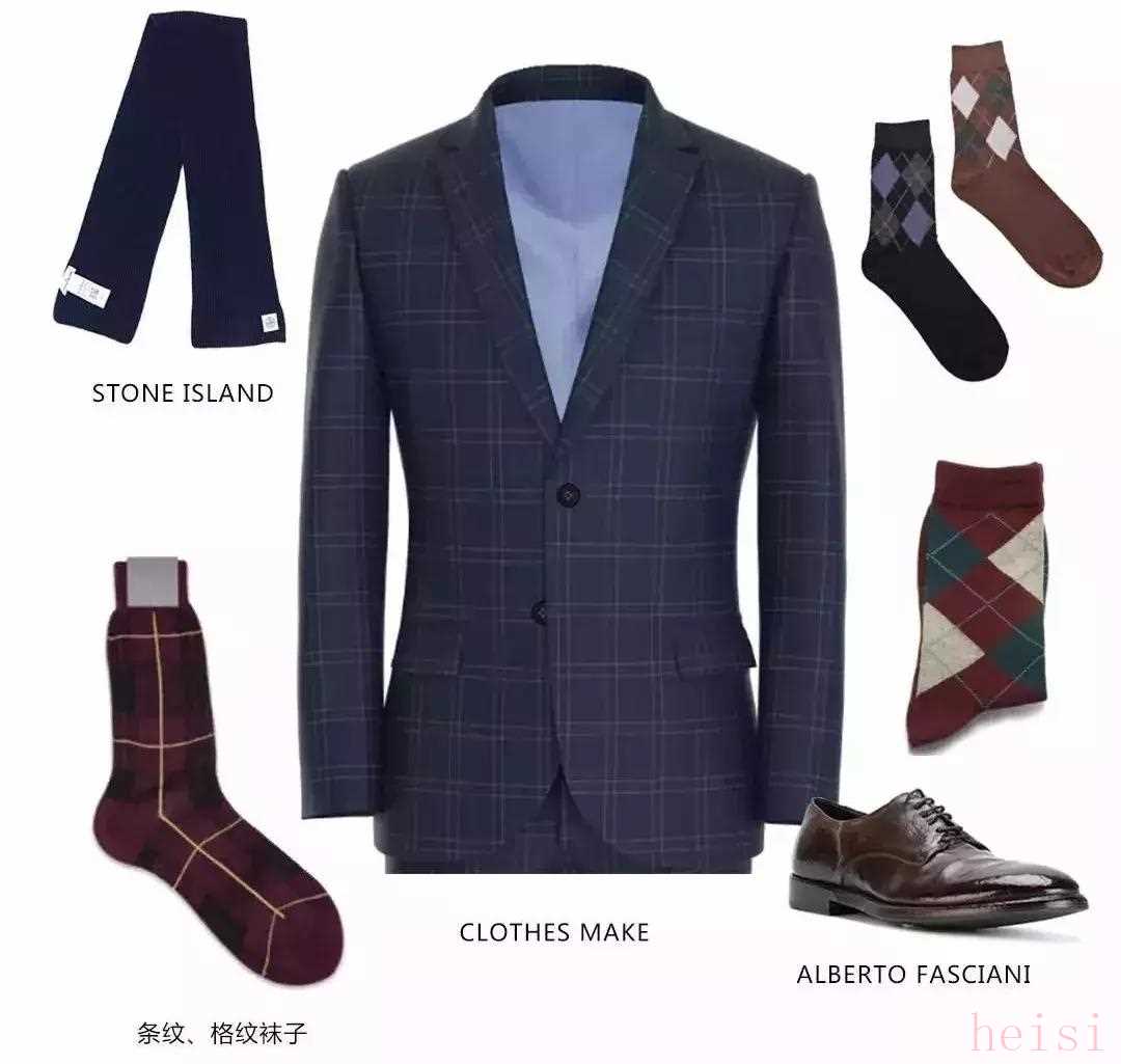 建議身上不要太多花紋,比如格紋的西裝搭配純色或者菱形的襪子就行,不要身上已經(jīng)有格紋,襪子又選擇條紋這些比較花哨的圖案。