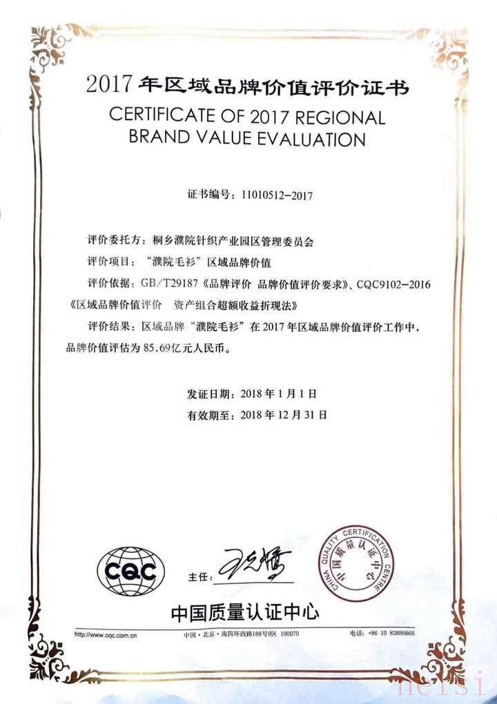 8月7日,記者從桐鄉(xiāng)市濮院鎮(zhèn)獲悉,日前,2017年中國區(qū)域品牌價(jià)值評(píng)價(jià)證書正式下發(fā),“濮院毛衫”區(qū)域品牌價(jià)值評(píng)估為85.69億元,比上年度升值14.24%。