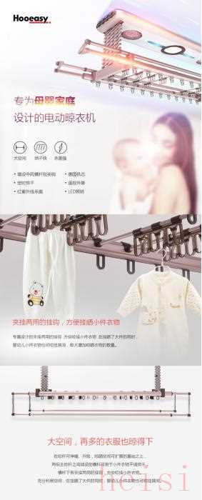 下面我們來(lái)看看好易點(diǎn)公司近期推出的HOO3C母嬰款智能晾衣機(jī)??纯粗悄茉谀睦?,為何稱之為母嬰款。