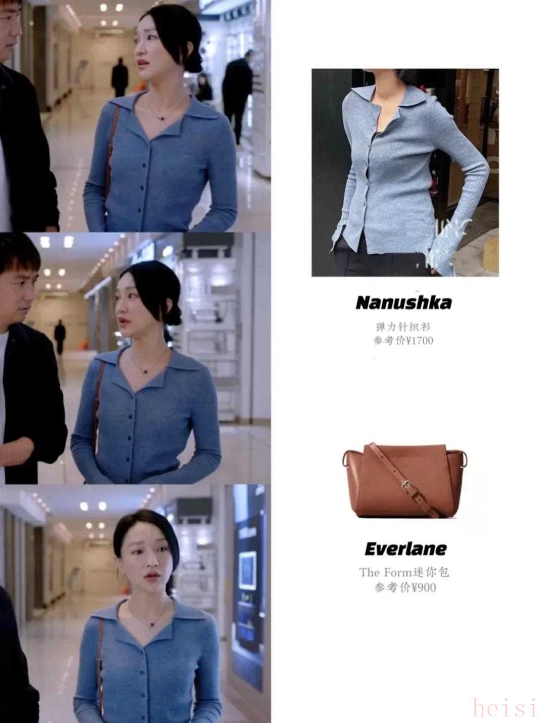 劇中周迅還有一件緊身針織也讓人眼前一亮,來自以皮革著稱的匈牙利小眾品牌Nanushka,它家服飾輕松簡約但不乏女人味,極簡也可以“娘酷”。這件天藍色針織顯得周迅更小一只了,更給人小鳥依人的感覺,搭配美式極簡品牌Everlane棕色包袋,藍棕撞色頗有幾分boylish的感覺。