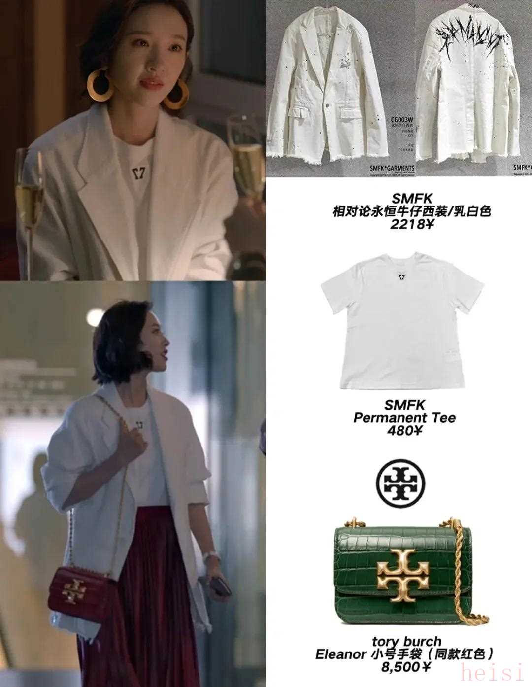 小婕這件牛仔西裝&白tee也是它家的,硬挺的牛仔面料打破傳統(tǒng)西服過于嚴肅的正式感,領口線條簡潔利落,保留西裝原有的干練率性。背部字母噴墨,既無路人感又不過于高調(diào),蠻符合劇中雜志社編輯的人設。