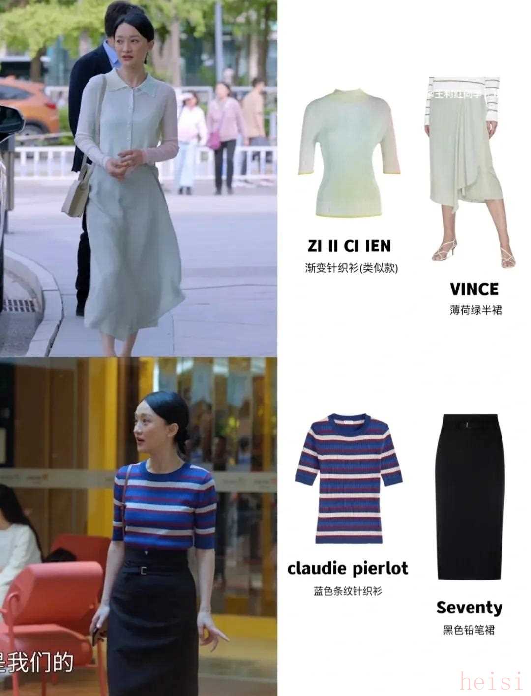 還有兩件緊身針織衫更類似OL風,凸顯成熟氣息。一套是薄荷綠,視覺降溫不少,搭配飄逸長裙,仙氣飄飄,氛圍感十足。另一套條紋短袖則偏干練,match黑色包臀裙顯高之余增強氣場,小個子職場穿搭模板,絕不出錯。