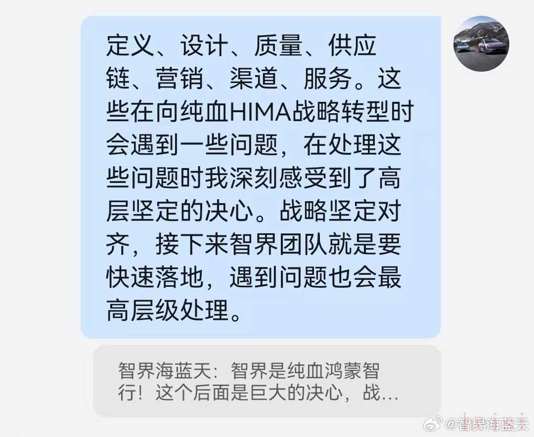 智界產(chǎn)品總監(jiān) @智界海藍(lán)天 還分享了一張聊天記錄的截圖,其中提到,定義、設(shè)計(jì)、質(zhì)量、供應(yīng)鏈、營(yíng)銷(xiāo)、渠道、服務(wù),這些在向純血 HIMA 戰(zhàn)略轉(zhuǎn)型時(shí)會(huì)遇到一些問(wèn)題。他表示,在處理這些問(wèn)題時(shí)感受到了高層堅(jiān)定的決心。接下來(lái)智界團(tuán)隊(duì)就是要快速落地,遇到問(wèn)題也會(huì)最高層級(jí)處理。