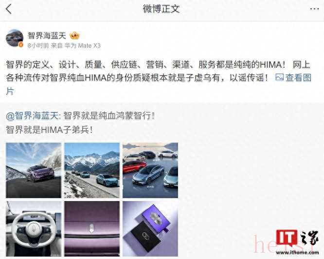IT之家 7 月 20 日消息,智界產(chǎn)品總監(jiān) @智界海藍(lán)天 今日發(fā)文稱(chēng):“智界的定義、設(shè)計(jì)、質(zhì)量、供應(yīng)鏈、營(yíng)銷(xiāo)、渠道、服務(wù)都是純純的 HIMA!網(wǎng)上各種流傳對(duì)智界純血 HIMA 的身份質(zhì)疑根本就是子虛烏有,以謠傳謠!”(IT之家注:HIMA 預(yù)計(jì)指鴻蒙智行。鴻蒙智行官網(wǎng)顯示,其全稱(chēng) Harmony Intelligent Mobility Alliance,縮寫(xiě)為 HIMA)。