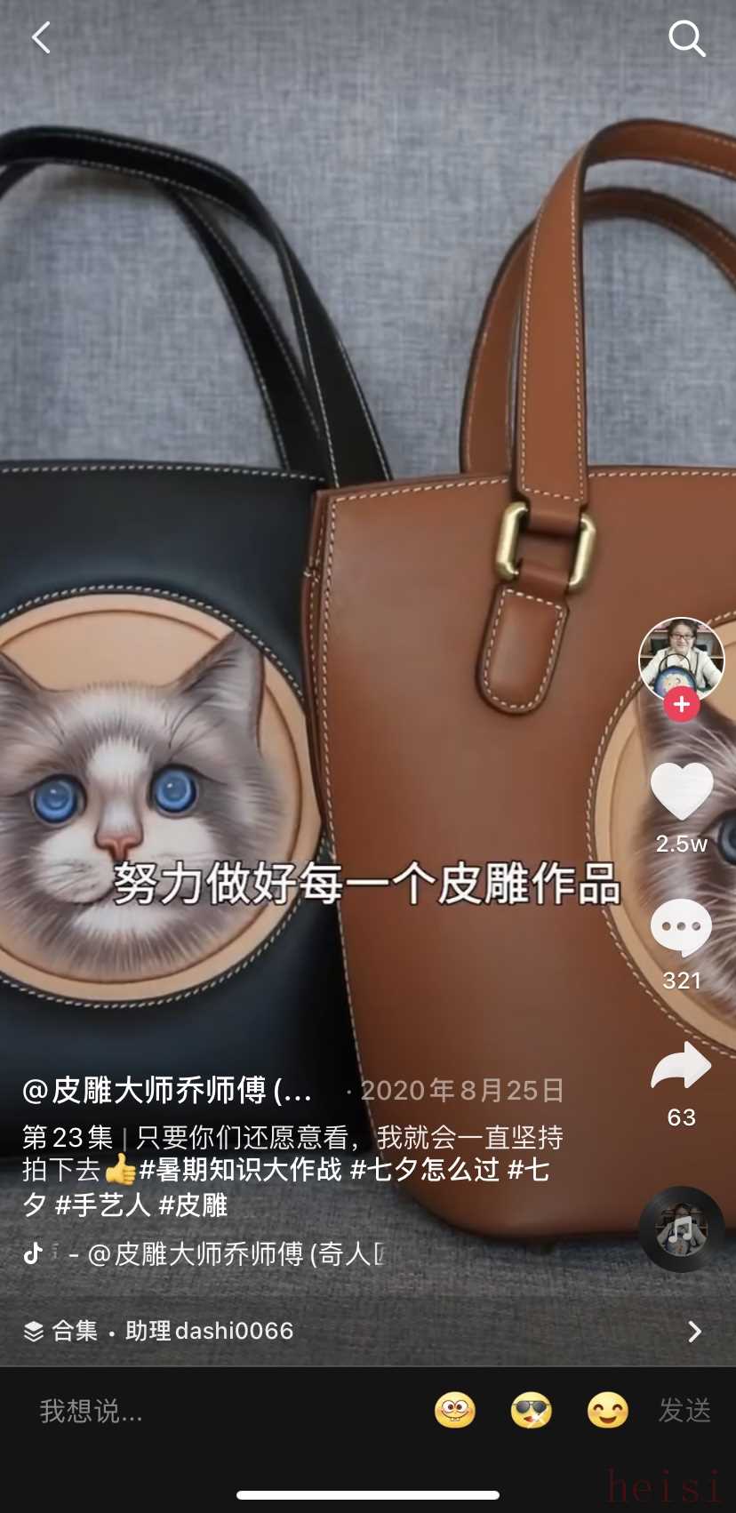 喬雪不斷在抖音@皮雕大師喬師傅(奇人匠心) 上更新自己做不同款式手工雕繪包的短視頻,平時(shí)背后繪圖72個(gè)小時(shí)、雕刻10萬(wàn)刀、敲擊60萬(wàn)次、上色3360分鐘,共126項(xiàng)的工藝流程,濃縮到幾十秒的視頻中,手藝人背后的故事呈現(xiàn)到了更多人面前。