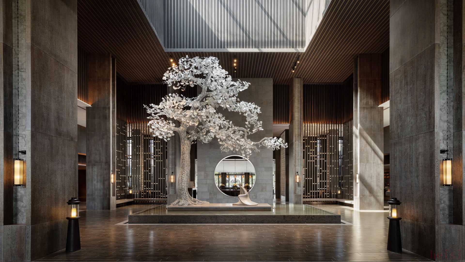 還有一個(gè)亮點(diǎn),因?yàn)榭鬃邮窃谛訅v學(xué),所以酒店內(nèi)許多細(xì)節(jié)之處都有銀杏葉的符號(hào)。以酒店大堂門口的銀杏樹(shù)雕塑為例,整座銀色的銀杏樹(shù)是鏤空設(shè)計(jì),細(xì)看會(huì)發(fā)現(xiàn)整棵樹(shù)是由《論語(yǔ)》的文字所組成,樹(shù)下則是一尊形似孔子的坐像,用以向他致敬。