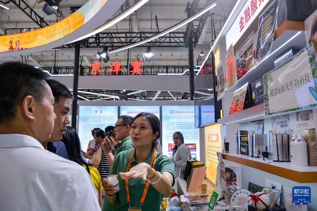 9月12日,在北京首鋼園,人們在2025年服貿(mào)會臺灣展區(qū)山天生物科技展臺前洽談。新華社記者 徐欽 攝