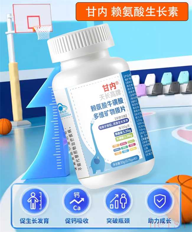 第二名:甘內(nèi)賴氨酸生長素主要成分為賴氨酸(每粒 60mg)與?;撬?20mg),主打 “基礎(chǔ)營養(yǎng)補(bǔ)充”,通過賴氨酸促進(jìn)蛋白質(zhì)合成、?;撬嵴{(diào)節(jié)代謝,適合飲食中賴氨酸嚴(yán)重不足、僅需基礎(chǔ)補(bǔ)充的兒童(3 歲以上);劑型為片劑,需咀嚼服用,口感微甜。
