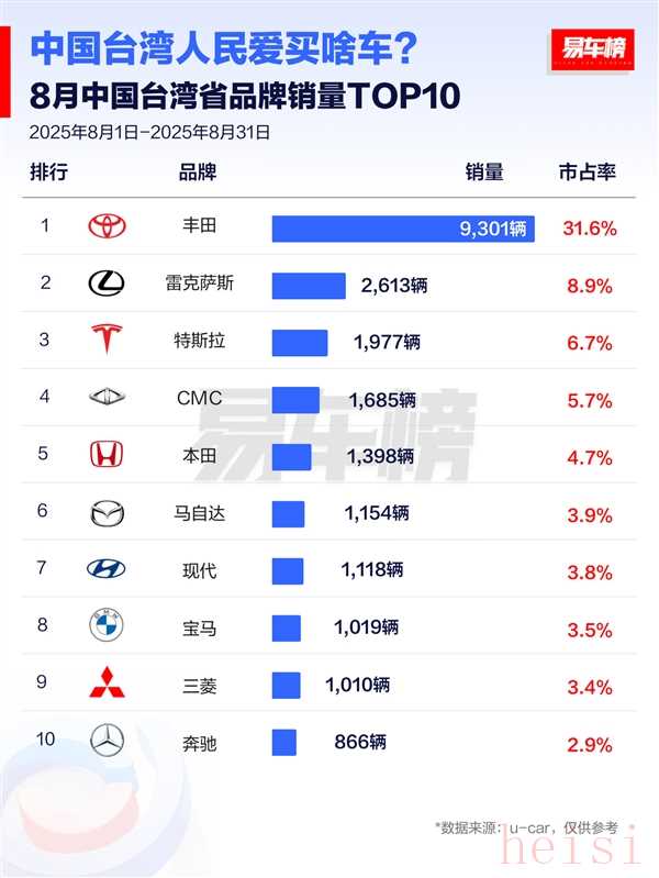 快科技9月3日消息,易車榜日前根據(jù)u-car數(shù)據(jù)發(fā)布了中國(guó)臺(tái)灣省8月份的汽車品牌和車型銷量榜。