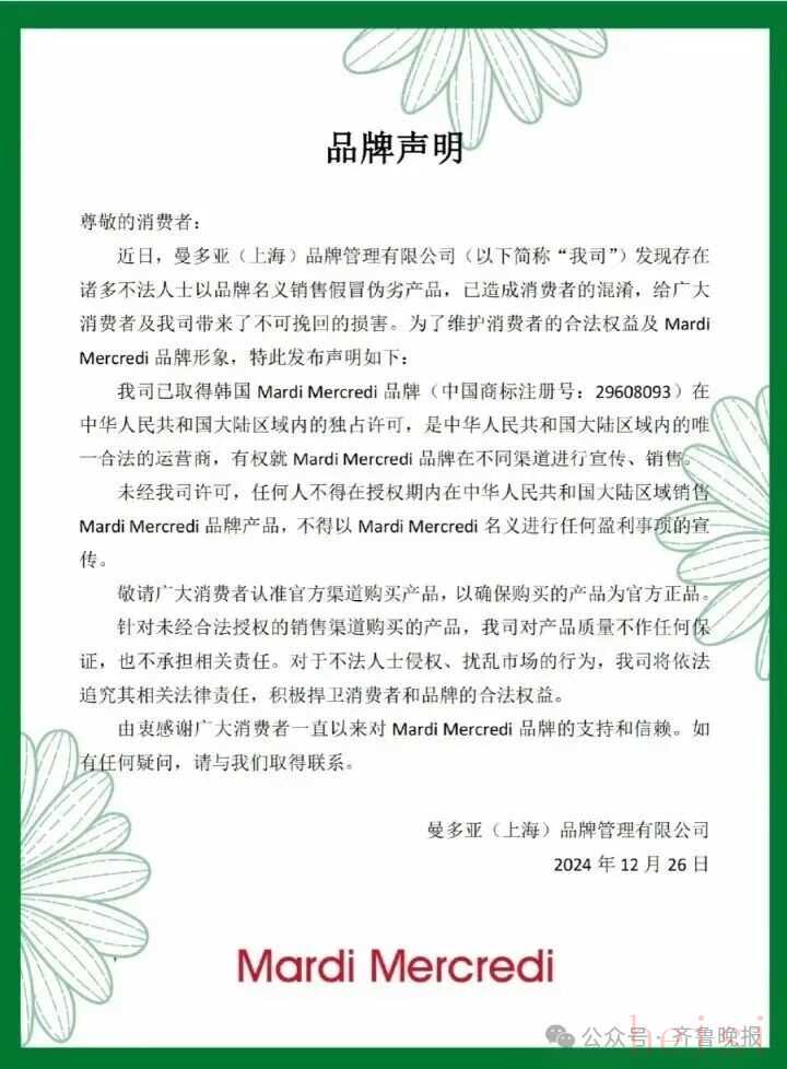 不過,中國市場一直存在大量Mardi Mercredi假冒品,近年來還有仿冒品牌在線下開出多家門店。曼多亞曾在2024年底發(fā)布聲明,稱其為Mardi Mercredi在中國大陸地區(qū)的唯一合法運營商。