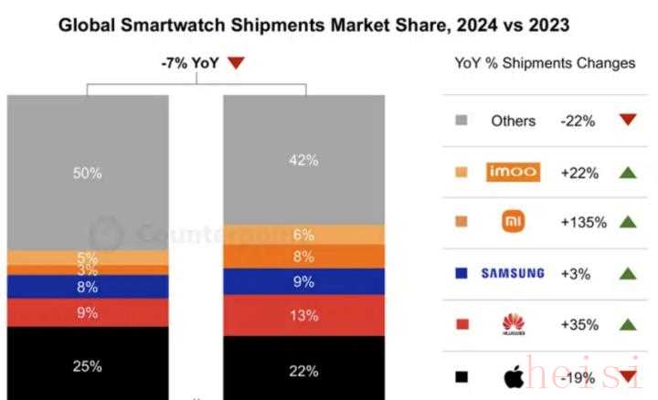 2023-2024年,蘋(píng)果手表的出貨市場(chǎng)占有率呈下降趨勢(shì),華為,小米等增幅最大