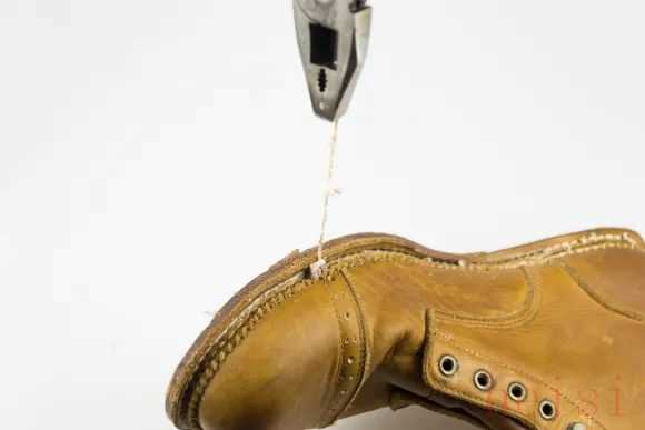 1. "雙線穿梭(Double Thread Weaving):" 這是挪威縫最顯著的特征。它使用兩根線(通常是手縫線,如Nubuck Line或蠟線),這兩根線會同時在鞋底和鞋跟/中底的接縫處來回穿梭,形成一種網(wǎng)狀或編織狀的加固結(jié)構(gòu)。