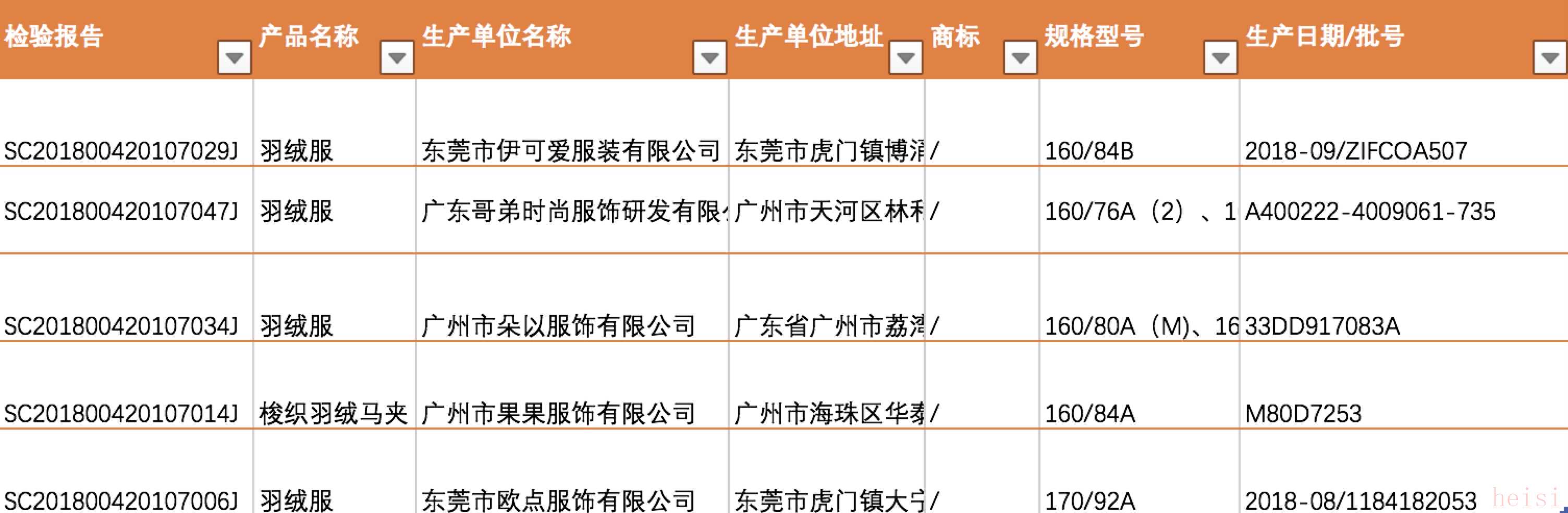 此次抽檢中,東莞市伊可愛服裝有限公司、廣州市朵以服飾有限公司、廣州市果果服飾有限公司、東莞市歐點服飾有限公司的羽絨服均被檢出不合格,項目涉及纖維含量、羽絨含絨量、絨子含量、羽絨充絨量。